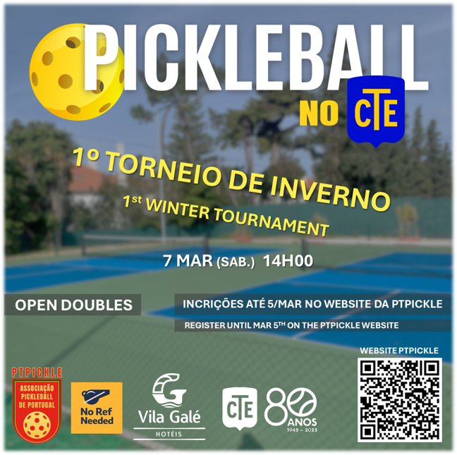 O inverno aquece com pickleball no Estoril! No sábado, 7 de março, o Clube de Ténis do Estoril recebe o seu 1.º Torneio de Inverno, com o apoio da PTPICKLE, NoRefNeeded e Vila Galé Hotéis.