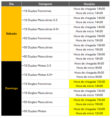 * Horários e categorias poderão ser alterados até à data do torneio em função das inscrições recebidas e desistência.